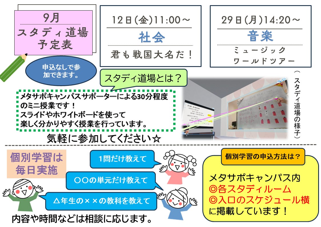 | ※ 担当スタッフが不在の日時やメタサポキャンパスでの活動予定等は、下のキャンパスカレンダーに掲載します。 |